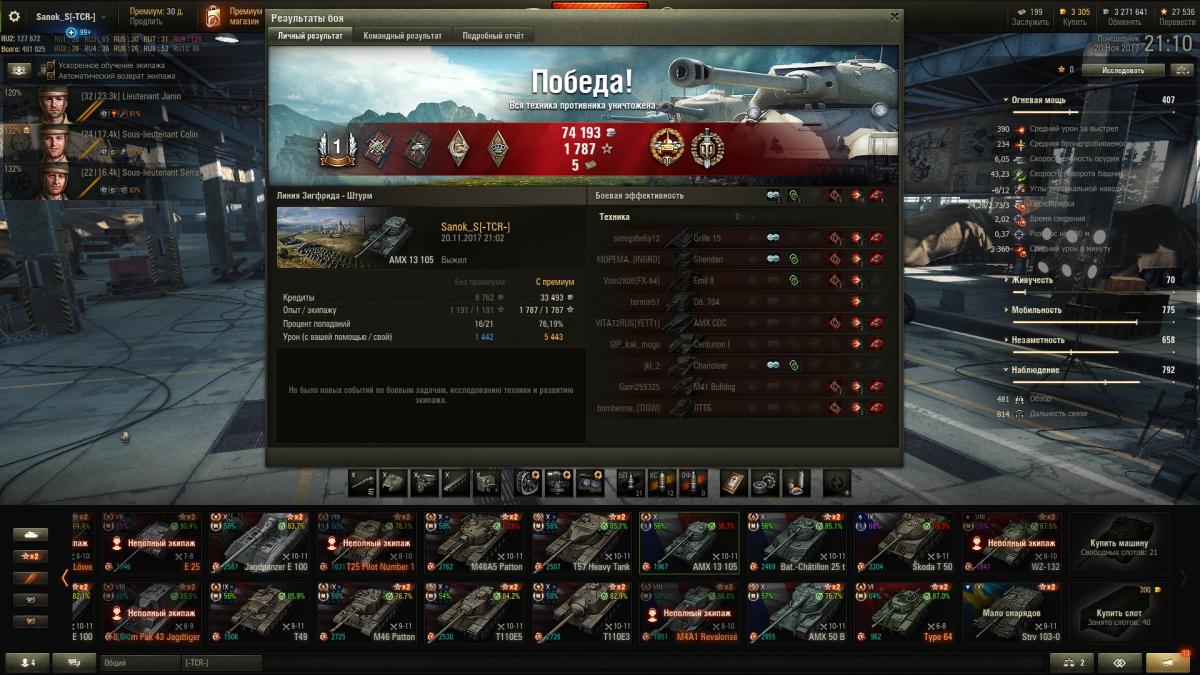OnColdWings Опубликовано: 27 ноября, 2017 Игроки 6 006 публикаций 17 420 боёв Автор Жалоба Поделиться Опубликовано: 27 ноября, 2017 (изменено) Прокатился 22 боя с 25 по 26. ЛБЗ так и не сделал с отличием за ЛТ. Потрачено 300к серы впустую. Похоже нужно переходить на 8 ур. Зато вкачал СТ6 шведов. Открыл за свободку СТ5 М4Шерман амеров, сделал элитным. Теперь нужно купить 2 машины и переобучить 9 человек. Еще бы не помешало покрасить со скидкой. Изменено 27 ноября, 2017 пользователем OnColdWings Ссылка на комментарий Поделиться на других сайтах Другие способы поделиться...