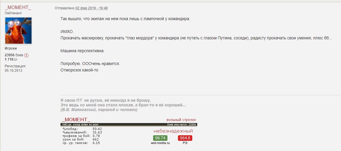 OnColdWings Опубликовано: 10 марта, 2019 Игроки 6 006 публикаций 17 420 боёв Автор Жалоба Поделиться Опубликовано: 10 марта, 2019 (изменено) http://cdn-frm-eu.wargaming.net/wot/ru/uploads/monthly_03_2019/post-3864146-0-53477400-1552224930_thumb.jpg ПТ очень нра Изменено 10 марта, 2019 пользователем OnColdWings 1 Ссылка на комментарий Поделиться на других сайтах Другие способы поделиться...