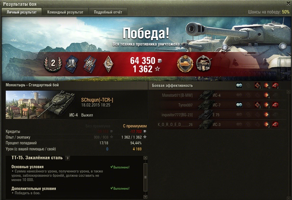 TheSunToucher Опубликовано: 18 февраля, 2015 Игроки 1 676 публикаций 5 894 боя Поделиться Опубликовано: 18 февраля, 2015 18 Фев 2015 - 17:23 пользователь Pahey_prim сказал:При счёте 2-7 вытащили бой. Победа -15-10Хорошо когда много жертв (8лвл)http://cdn-frm-eu.wargaming.net/4.3/style_emoticons/wot/Smile_Default.gifhttp://wotreplays.ru/site/4674654#aerodrom-pahey_prim-e_50_ausf_mhttp://i60.fastpic.ru/big/2015/0218/b1/5f9df3596fc47a14bfc58045184f16b1.jpg Да если даже и 10, бочком же ) Мне понравился отход на пристреленную позицию ) Ссылка на комментарий