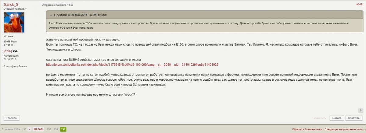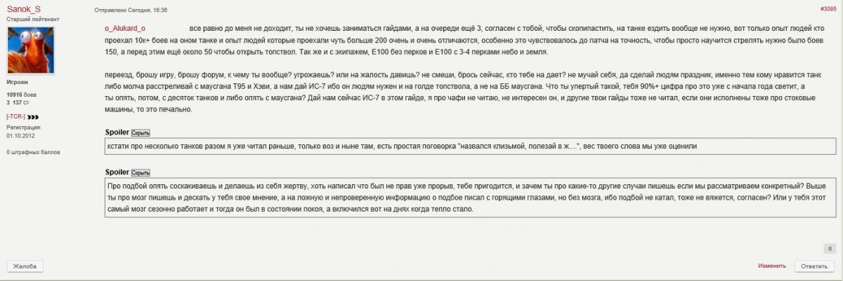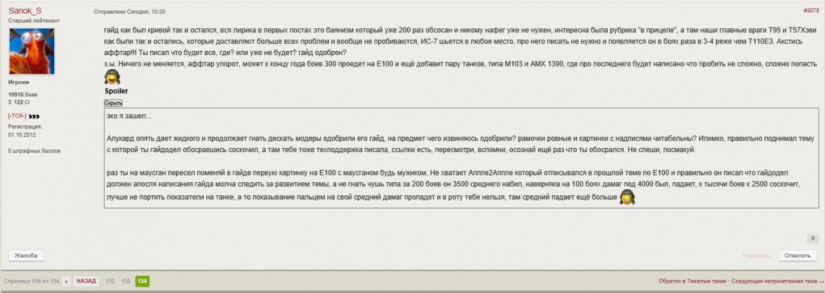 4ecHoK_Ha_CoTke Опубликовано: 19 февраля, 2015 Игроки 2 915 публикаций 25 444 боя Поделиться Опубликовано: 19 февраля, 2015 19 Фев 2015 - 10:25 пользователь OnColdWings сказал:НАШЕЛ !!Преамбула - был гайд по Е-100, на котором воспитывалось много норм. игроков, в котором было все, который делался можно сказать всем миром и который оформила игрок Моралес со всеми ссылками на все предыдущие.Так вот, нарисовался челл с 200+ боями на Е-100 и начал учить людей катать. Ну да ладно, но !! Он не сделал того важного в своём гайде - куда пробивать Ис-7 и еще чего то там, что я уже и не помню. Я тогда активно следил за веткой Е-100 и меня как то задело это. В первых постах нового гайда можно прочитать, как я негодовал. Тут нарисовался Саня. Ну я и придумал рассказик на эту тему - тыцНу затем конечно автор гайда много чего переделал и добавил в гайд, но наполучал по шапке изрядно, кармы ему слили где то 200-300. И получилось то, что сейчас имеем. а помню помню этот срач между Саней и алюкартом (или как его там), я тогда еще на vld78 катал) Ссылка на комментарий Поделиться на других сайтах Другие способы поделиться...