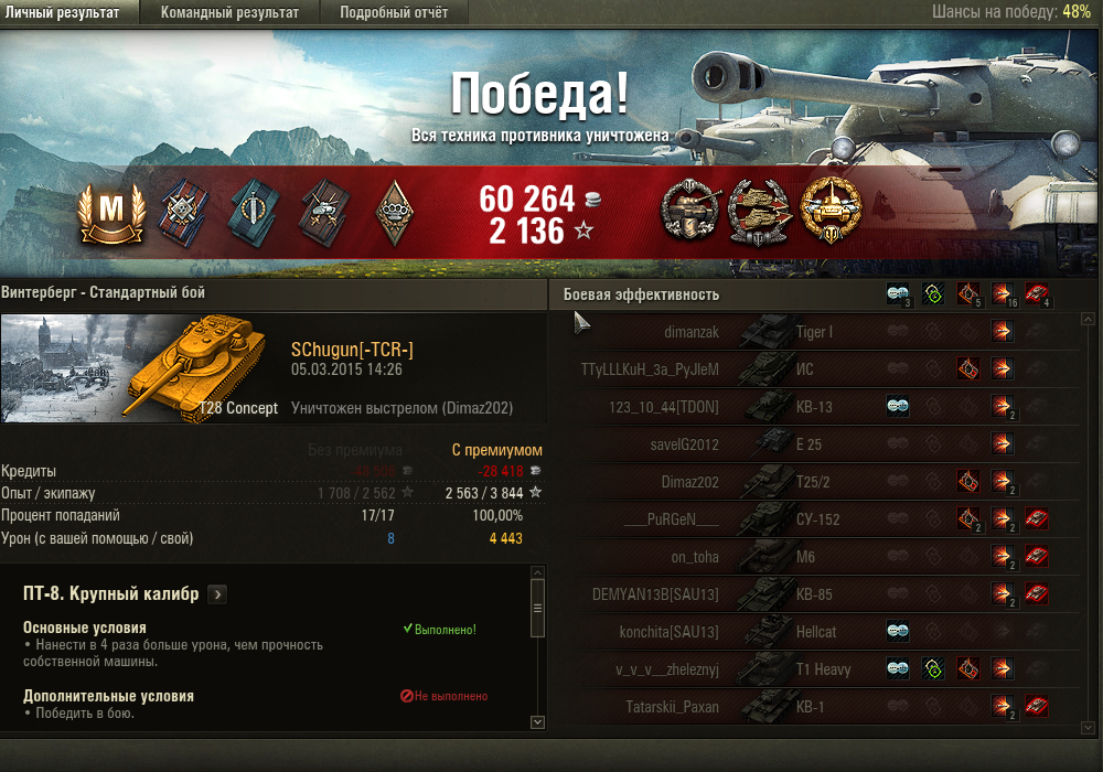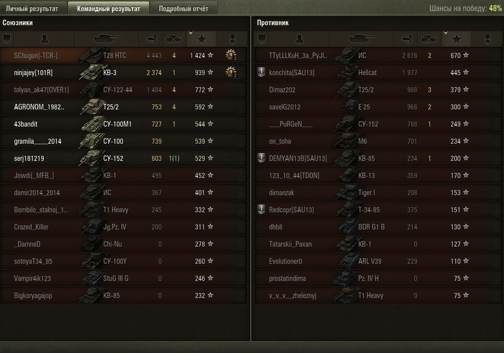 Стас, я понял как надо играть в танки, даже твинк не нужен, просто берешь взвод СТ из 3-х штук, плевать каких, главное взвод, в нашем случае был сначала я, Чугун и мой братан (Е50М + 140 + японец 9 лвл, что перед СТБ), далее Гурамчик пришел, он разную технику ставил, просто едите и аннигилируете все, без разницы кто против вас, хоть ТТ, хоть ПеТе, хоть арта, хоть статисты, хоть раки, все показатели в гору, в том числе и дамаг, у меня сейчас осталось последнее задание на концепта убить на СТ 3 ПеТе + выжить и победить в бою, катаю мытага и бачу по очереди, если на мытом как глубоководный рачок слился в начале боя, то ставлю бачу и у бой, вчера и сливался как дно и вытаскивали взводом бои, было всяко, ничего сверхъестественного не делал вообще. Просто играл, без напряга.
