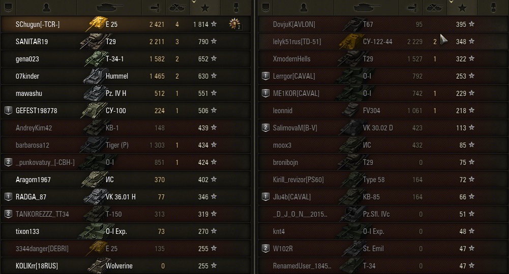 Pahey_prim Опубликовано: 23 сентября, 2015 Игроки 5 082 публикации 24 904 боя Поделиться Опубликовано: 23 сентября, 2015 Я не спешу с прокачкой танков, поэтому мне этого за глаза. Пару дней отдохну и тогда уже плотнячком сяду на Е25 и Блэк Принца/ФВ201, качать экипажи, специально для этого оставил десяток резервов +100% к опыту экипажа, а там и на ЯгуЕ100 пойду. В рот вас… Мама целовала Ссылка на комментарий