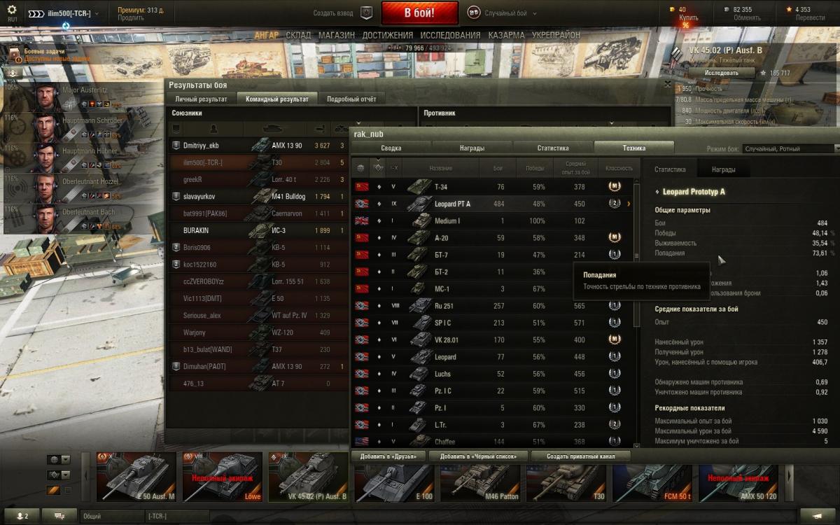 ilim500 Опубликовано: 1 ноября, 2015 Игроки 19 460 публикаций 43 276 боёв Поделиться Опубликовано: 1 ноября, 2015 01 Ноя 2015 - 22:23 пользователь OnColdWings сказал:Дело не в цвете. Дело в подходе к игре. А прогресса нет, по отношению к проведенным боям. Это настораживает очень сильно. Какой может быть прогресс в пикселях?По моему - только эмоции))краснота получает свой адреналин - вот меня на Т30 только что подсасывателем 5-ых фрагов леопта обозвал.Ну думаю - статист какой справедливо критикует - ведь и вравду крысил))Послал его по известному адресу и посмотрел стату в конце боя: http://cdn-frm-eu.wargaming.net/wot/ru/uploads/monthly_11_2015/post-1654869-0-48132500-1446407768_thumb.jpgудивился, посочувствовал - а ведь человек тоже может быть недоволен игрой прям по похожим причинам)))Тоже мол - прогресса нет, везде одни Т30, которые подсасывают скальпы, а сами играть не дают, не? [-A-W-] The Angels of War Ссылка на комментарий