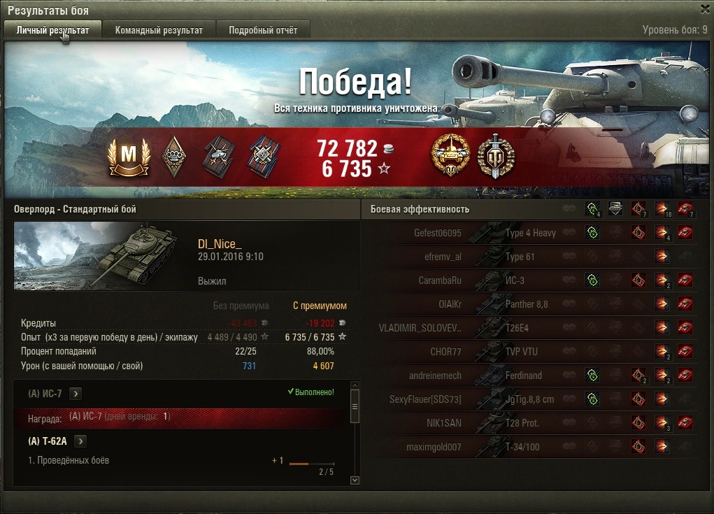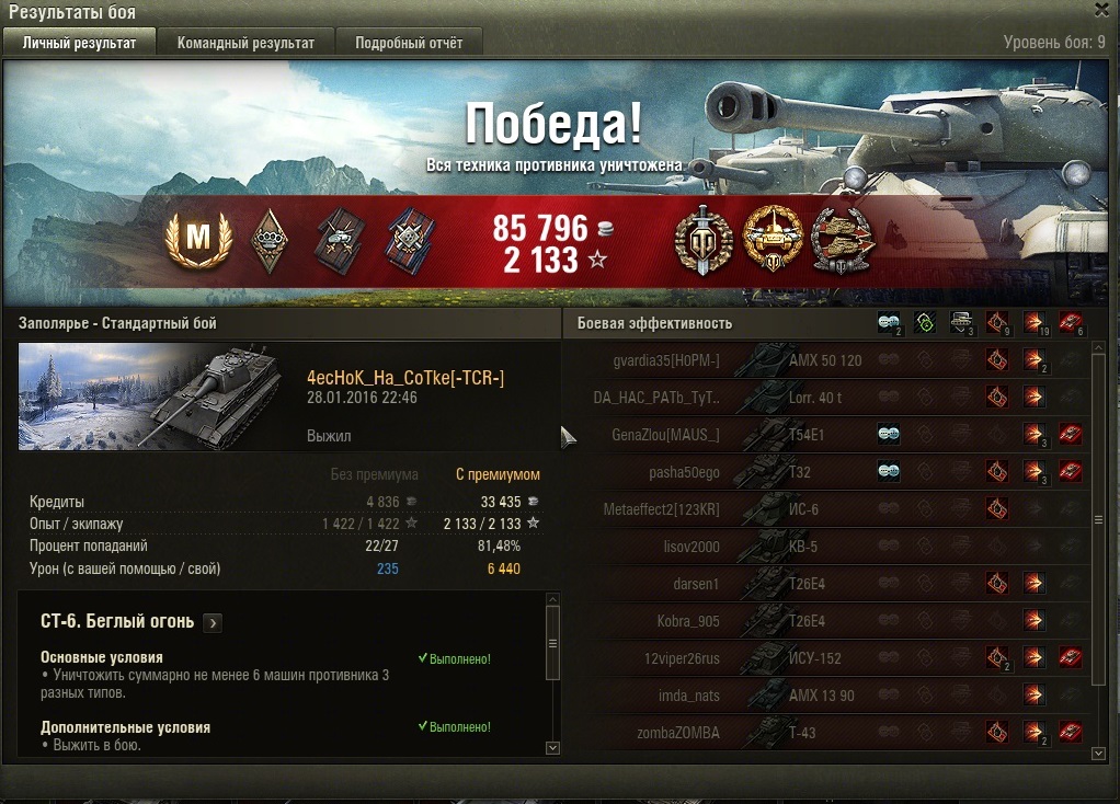 Sanok_S Опубликовано: 29 января, 2016 Игроки 9 576 публикаций 33 973 боя Поделиться Опубликовано: 29 января, 2016 (изменено) 28 Янв 2016 - 20:10 пользователь ilim500 сказал:Тама фиолет есть - Тцунами - он же Магометнульпятьрус - так для него вопрос перехода на е50м - однозначен)после отмены 12 уровня боёв - катать 9-4и, ради того, чтобы они в 30% оказывались в боях, где есть 7 уровни - ниочинь)а так - ставь на запись последний реплей - и если чего стоящего - кидай на вотреплейс)Командир авось даже чего на клановый канал ю-туба закинет)Не знаю Илим на счет твоей нелюбови к е50, всякие разные Миго, Струке, Скулексы и т.п. как раз на е50 и паттоне 9 уровня себе апают вин 8, был бы танк ниочень, статисты бы его не катали, в чем подвох я не знаю, кто знает откройте тайну. Я очень давно е50 катал, даже не поню какой он был, оооочень давно это было, а на мытом мне играть нравится, закончу с качем сяду опять на 10ки, я все таки надеюсь что все свои 10ки смогу довести до уровня 2,5к+ среднего и 55% винрейту, просто для себя.По поводу КЛа ты загнул конечно, на клановый ютуб запишет? я наверное больше всех и практически регулярно выкладываю что скрины, что репки, ни одного видоса Стас не запилил, видимо я просто не достоин да и что тут говорить, их даже не смотрит никто 29 Янв 2016 - 02:01 пользователь Pahey_prim сказал:Пятница, очередная акцияhttp://worldoftanks.ru/ru/news/pc-browser/11/stalingrad_victory_16/да, 2 февраля для Волгограда и области есть памятная дата. Когда Сталинград только начали бомбить фашисты, за 3 часа бомбежек погибло 70к+ человек, 140к+ были ранены, 50+ предприятий разворотили, здесь была жесть, фюреру нужны были наши заводы, здесь практически весь город был промзона на берегу Волги, люди жили вокруг крупных заводов, притом всяких разных. На время войны заводы перевезли на Урал, оттуда на войну везли все что нужно. з.ы. по поводу акции х3 мне на руку, возможно сегодня на т54 смогу гусянки поставить и танк будет топ, а на т-10 чуть больше 10к осталось и тоже будет топ. Изменено 29 января, 2016 пользователем Sanok_S Ссылка на комментарий