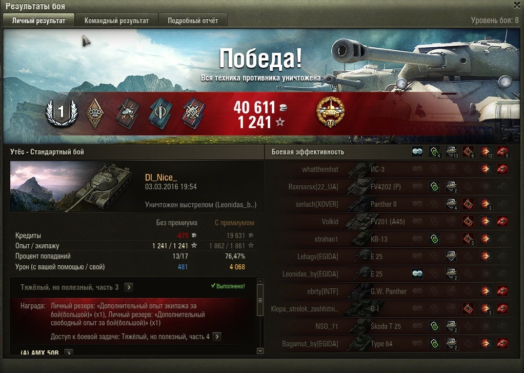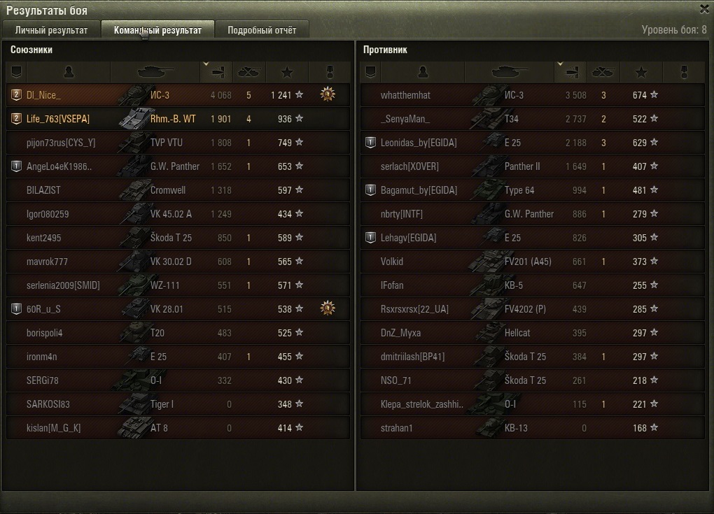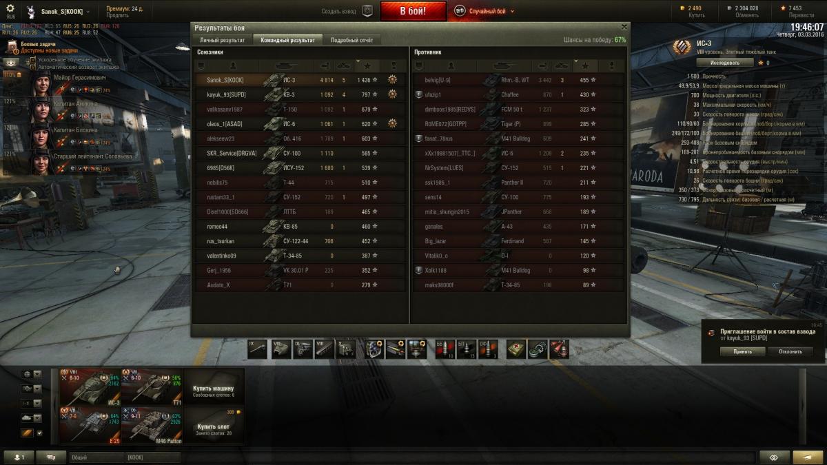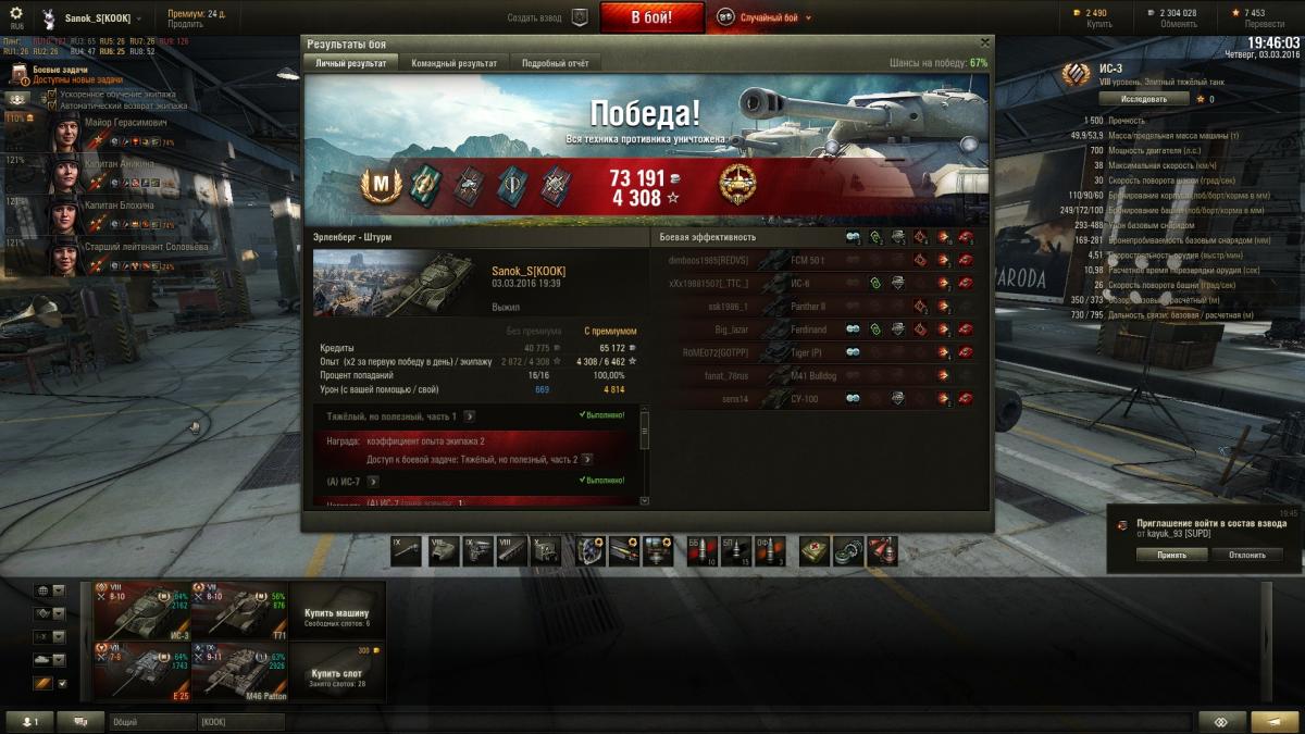 TheSunToucher Опубликовано: 3 марта, 2016 Игроки 1 676 публикаций 5 894 боя Поделиться Опубликовано: 3 марта, 2016 (изменено) Все почитал, посмотрел - красавы.А я ...Я реально психану и продам это СТ. Какая там пуха ? Л70 ? Да там хз что ... Сегодня было так. Начал на 2 сервере. Катал КВ-1 и Т14. Кидало всегда не в топ. В середину и низ. 2 раза за один бой клиент делал так - танк крутит башней - все остальные танки стоят. Как будто инет отваливается. Но ничего подобного. Все норм. Плюнул, перешел на РУ5. Кидает к 6 но их 2-3. Поиграл чутка, покатал злощаную 30.02, слился и перешел на РУ6 - нагиб пошел.Саня, у меня почти все куплено, что хотел. Что еще не купил - нужно исследовать. В данный момент простаивают без экипажей и оборудование не на всех:Штуг3, ЯгдПз4, Штуг4, Джамбо, КВ-1С.Открываю бритов СТ за свободку, хочу Шерман ФаерФлай для коллекции.На КВ-1 поиграл так себе сегодня, как и на Т14, но взял 2 звезду. Буду идти на 3.Психанул и продал стаб со склада. В итоге сессия из 26 боев с премом сьела 250к серы. КВ-1 и Т14 у меня шикуют. На акке сейчас почти 28к серы ... нужно фармить. А стаб продал, т.к. мне он не нужен в ближайшее время, а денег не было, все пустил на покупку танков. Изменено 3 марта, 2016 пользователем TheSunToucher Ссылка на комментарий Поделиться на других сайтах Другие способы поделиться...