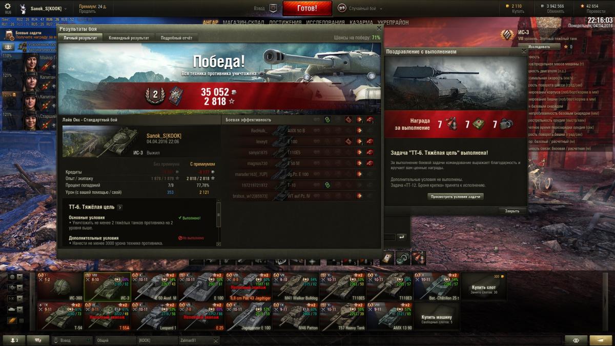 Sanok_S Опубликовано: 4 апреля, 2016 Игроки 9 576 публикаций 33 973 боя Жалоба Поделиться Опубликовано: 4 апреля, 2016 (изменено) как-то такhttp://worldoftanks.ru/ru/news/pc-browser/1/last_stand_withdrawal/ ну и маленько опять мы вот так вот маленько, но к сожалению для ЛБЗ ни мне ни Чугунку не достаточно Ему надо 4к по ПТ+выжить и победить, а мне просто 8к и 5 фрагов, можно даже сдохнуть и проиграть .http://cdn-frm-eu.wargaming.net/wot/ru/uploads/monthly_04_2016/post-10821115-0-66035400-1459787976_thumb.jpghttp://cdn-frm-eu.wargaming.net/wot/ru/uploads/monthly_04_2016/post-10821115-0-05349800-1459787980_thumb.jpghttp://cdn-frm-eu.wargaming.net/wot/ru/uploads/monthly_04_2016/post-10821115-0-11001900-1459787983_thumb.jpg http://cdn-frm-eu.wargaming.net/wot/ru/uploads/monthly_04_2016/post-10821115-0-71822300-1459795331_thumb.jpghttp://cdn-frm-eu.wargaming.net/wot/ru/uploads/monthly_04_2016/post-10821115-0-53267600-1459795334_thumb.jpghttp://cdn-frm-eu.wargaming.net/wot/ru/uploads/monthly_04_2016/post-10821115-0-33970700-1459795337_thumb.jpghttp://wotreplays.ru/site/7725567#himmel_sdorf-sanok_s-jagdpanzer_e_100 хоп, на 5 бою http://cdn-frm-eu.wargaming.net/wot/ru/uploads/monthly_04_2016/post-10821115-0-53163500-1459797475_thumb.jpg Изменено 4 апреля, 2016 пользователем Sanok_S Ссылка на комментарий Поделиться на других сайтах Другие способы поделиться...
