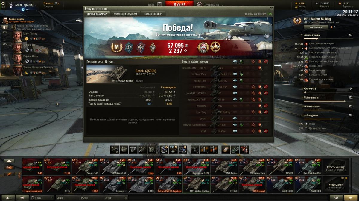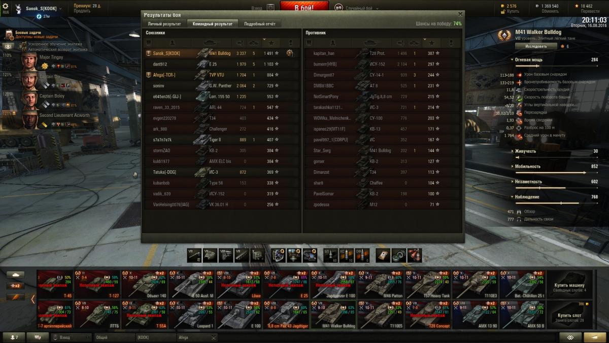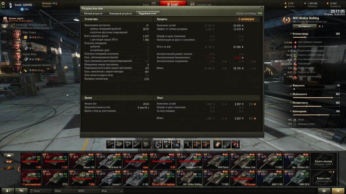 Sanok_S Опубликовано: 17 августа, 2016 Игроки 9 576 публикаций 33 973 боя Поделиться Опубликовано: 17 августа, 2016 (изменено) здравствуйте, здрастье солнышки, посмотрел и почитал все что вы написали, резюмирую. Стас, мой тебе бесплатый совет следующий, для начала в мутце катай самый жирный экипаж какой у тебя только есть на немецком СТ, в оборудование ставишь стаб+досыл+оптику, шоко обязательно, смотри чтобы в наличии был ОГ у командира, хотя бы частично, тогда твой обзор будет 445+ метров. Далее смотри чтобы на всех гансах была маскировка, плавный ход и плавный поворот, таким макаром у тебя будет самый высокий буст точности твоего танка.по перкам стремись вот так:ББ+лампа+рем+маска+ОГ на докачку, хоть чуть, уже с обзором будет порядок (на начльных этапах можешь ББ+лампа+ОГ маст хэв, маска и рем потом по ситуации)ББ+рем+маска+ППБ, дальше как хочешьББ+рем+маска+ПХ, дальше как хочешьББ+рем+беск. боеуклад+маскадалее на таком танке с таким экипажем катаешься, много ездишь, постоянно меняешь позиции, в боях с 9 и 10 лвл не брезгуешь стрельбой подкалиберами, если нужно стреляешь только ими, добавь их хотя бы до 20 штук, если есть склонность к тому что пульки могут закончится, то убирай нафег фугасы, ими почти не пользуемся. Далее проедешь так боев эдак 100-150-200+ и у тебя уже будет ясность как готовить оный танк, игра на нем проста до безобразия, играешь от УВН и из-за горочки кажешь тильки башенку, ты будешь крайне удивлен на сколько -10 УВН есть комфорт, это так сказать паттон стайл, ну и на бульдоге я играю так же. Привыкай к пушке, смотри как она сводится, смотри на разброс в кругу сведения, возможно орудие его позволяет стрелять в пиксели без полной сводки, привыкнешь, снаряды не жалей, на преме они дешевые. Пока так, т.е. сейчас ты будешь привыкать к танку, будешь фармить бабло, определишь по каким направлениям кататься, поймешь куда ты по таймингу успеваешь, а куда нет, не стремайся подсвечивать башенкой только показав ее из-за бугра, например подсвет горы на дуге и т.д. Учитывая что у танка отличные УВН теперь тебе не нужно будет вылазить из всяхих разных укрытий полностью и оголять весь копус, достаточно только зыркнуть башней, дать плюху и сползти назад.После того как танк ляжет в руку, ты будешь богат и успешен, подтягивай гансов для прокачки, короче пробуй. Я все таки мечтаю закончить с ЛБЗ, фармом на премах, выкачивании техники и играть во фан, много играть на 10ках где пульки и так пробивают, а танки фармят, посмотрим, пробуй одним словом, если танк тебе понравился это замечательно, поймай его искорку, ниточку и смакуй параллельно забивая склады серой, твоя задача 2к+ средухи сейчас, старайся не менять сильно ХП, береги его до последнего, держи дистанцию, реализуй точное и скорострельное орудие, стреляй по каткам, такова игра на индюшке и лео 1, лео ПТ фуфел ибо нету нужных нам увнов, а картон так же как и на Лео присутствует. з.ы. выполняй ЛБЗ на 55ку, бери дам, это будет твой смежный экипаж на мутца, т55 и лео 1, бабы будут расти как на дрожжах, шоко не брезгуй, он рэально бустит танк по всем показателям, а на прем танке будет окупаться с лихвой. Как-то таг. Изменено 17 августа, 2016 пользователем Sanok_S Ссылка на комментарий Поделиться на других сайтах Другие способы поделиться...