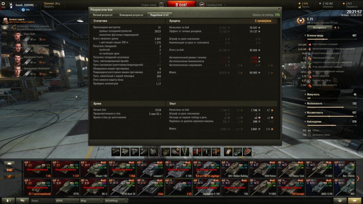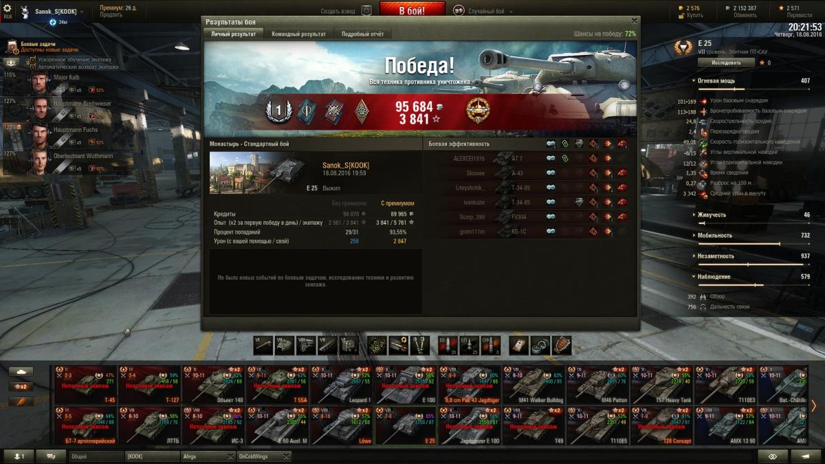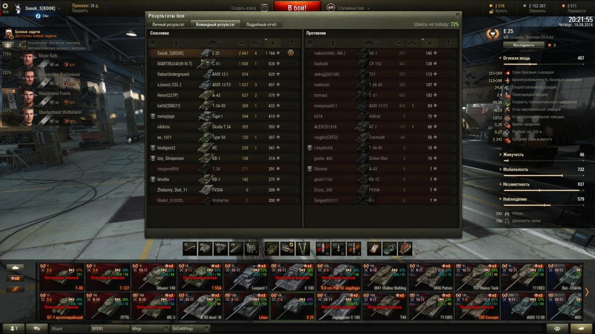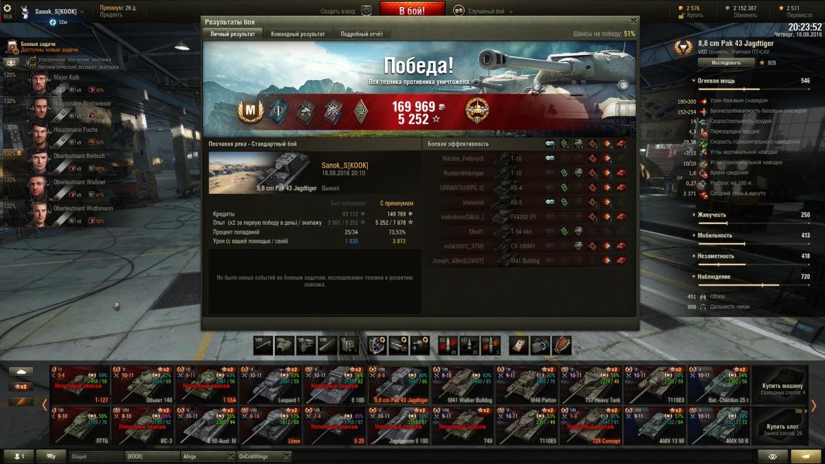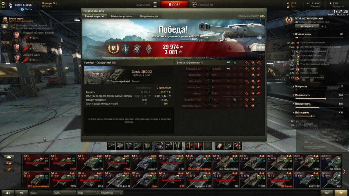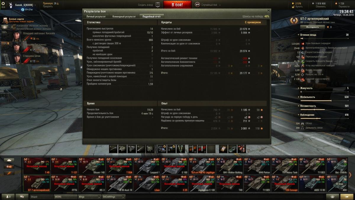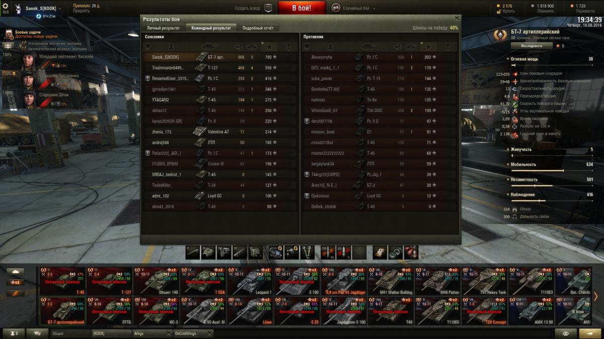 Sanok_S Опубликовано: 19 августа, 2016 Игроки 9 576 публикаций 33 973 боя Поделиться Опубликовано: 19 августа, 2016 ну шо господа хорошие и не очень, седни красим танки? вчерась заработал ишо миллион, до деда 7 осталось 1,5кк, на выходных однозначно куплю и покрашу за голду + буду продолжать активно выкатывать 4 ЛТ советов для апа 5 гансов в деда, на 3-х уже 1,7 полных перка, на 1-м 1,3 и на 1-м почти 1 полный, для начала в деда надо иметь хотя бы 2,5 полных для всех нужд, катать буду стараться ежедневно до ближайшей скидки на переобучение экипажу, а как будет скидон, пересажу гансов в деда, а в ЛТТБ опять найму ещё 4 гансов и 1 в т-127, буду ещё 5 выкачивать на будущее, пригодится. Наверное малышей аля бт-7 арт покрашу за голду, прикольный танк, подарочный 2-го уровня просто за серу на месяц покрашу, мне он не нравится вообще, 127 уже покрашен за голду, подарок Литвинтроля, ЛТТБ так же на месяц покрашу, он хуже чем буль, выкачаю ещё один экипаж и продам его нафег. катал вчерась с Афегой и Чугунком, было весело. Вывел в топ т49, заглянул в казарму, выгнал вшивых бесперковых упырей с танков что с режима на т-22 остались (красные т62, 50б и ис7). Посмотрел на товарищей для паттона 10, которых решил сейчас пока на ЛТ катать, как будет скидон заточу их на бульдога, там около 2,5 полных перка, а экипаж с буля пойдет в т49, там 3,9 полных, как раз на обоих танках будет тот самый минимум, который необходим для безболезненного выкатывания в рандом + т49 покрашу за голду, Чугун оный танк хвалит, посмотрим как он у меня заиграет, хотя тот же БТ-7 арт на своем уровне как т49 на своем, думаю нормально все будет. как-то так, сегодня я последний день и в отпуск, так шта... Ссылка на комментарий Поделиться на других сайтах Другие способы поделиться...