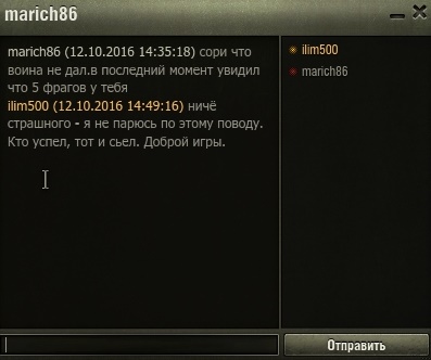 ilim500 Опубликовано: 12 октября, 2016 Игроки 19 460 публикаций 43 276 боёв Поделиться Опубликовано: 12 октября, 2016 И да - было 5 скальпов - так какой народ вежливый и куртуазный пошёл:http://cdn-frm-eu.wargaming.net/wot/ru/uploads/monthly_10_2016/post-1654869-0-52824500-1476273057_thumb.jpgпрям ого-го какие добрые и правильные люи населяют Большой Рандом)) [-A-W-] The Angels of War Ссылка на комментарий
