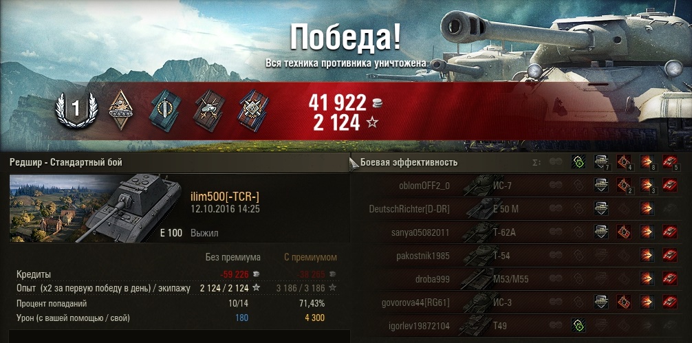 ilim500 Опубликовано: 12 октября, 2016 Игроки 19 460 публикаций 43 276 боёв Поделиться Опубликовано: 12 октября, 2016 (изменено) снял звезду с е100нца на 1 кляссность:http://cdn-frm-eu.wargaming.net/wot/ru/uploads/monthly_10_2016/post-1654869-0-96897400-1476272693_thumb.jpg http://cdn-frm-eu.wargaming.net/wot/ru/uploads/monthly_10_2016/post-1654869-0-94386600-1476272716_thumb.jpgминус 60.000... если с премом этих цыфр особо не замечал - то сейчас, сотка, как единственный голдотанк в ангаре, фан несёт, конечно - бк вот в скулу ис-7 взорвал ...но возможно пересажу экипаж на котэ, 75 или тапка, а то и ягра) Изменено 12 октября, 2016 пользователем ilim500 [-A-W-] The Angels of War Ссылка на комментарий