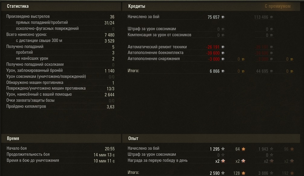 а вот этот бой на индиане в 0.8.5 в 13 году, при выходе ветки лео у немцев - принёс мну 2.500 золота))